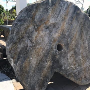 The Millstone is a giant 6'6" round stone. This masterpiece can be left standing, have a fountain come up through the middle or used around a flagpole. The possibilities are endless! Shown in Silver Lining.